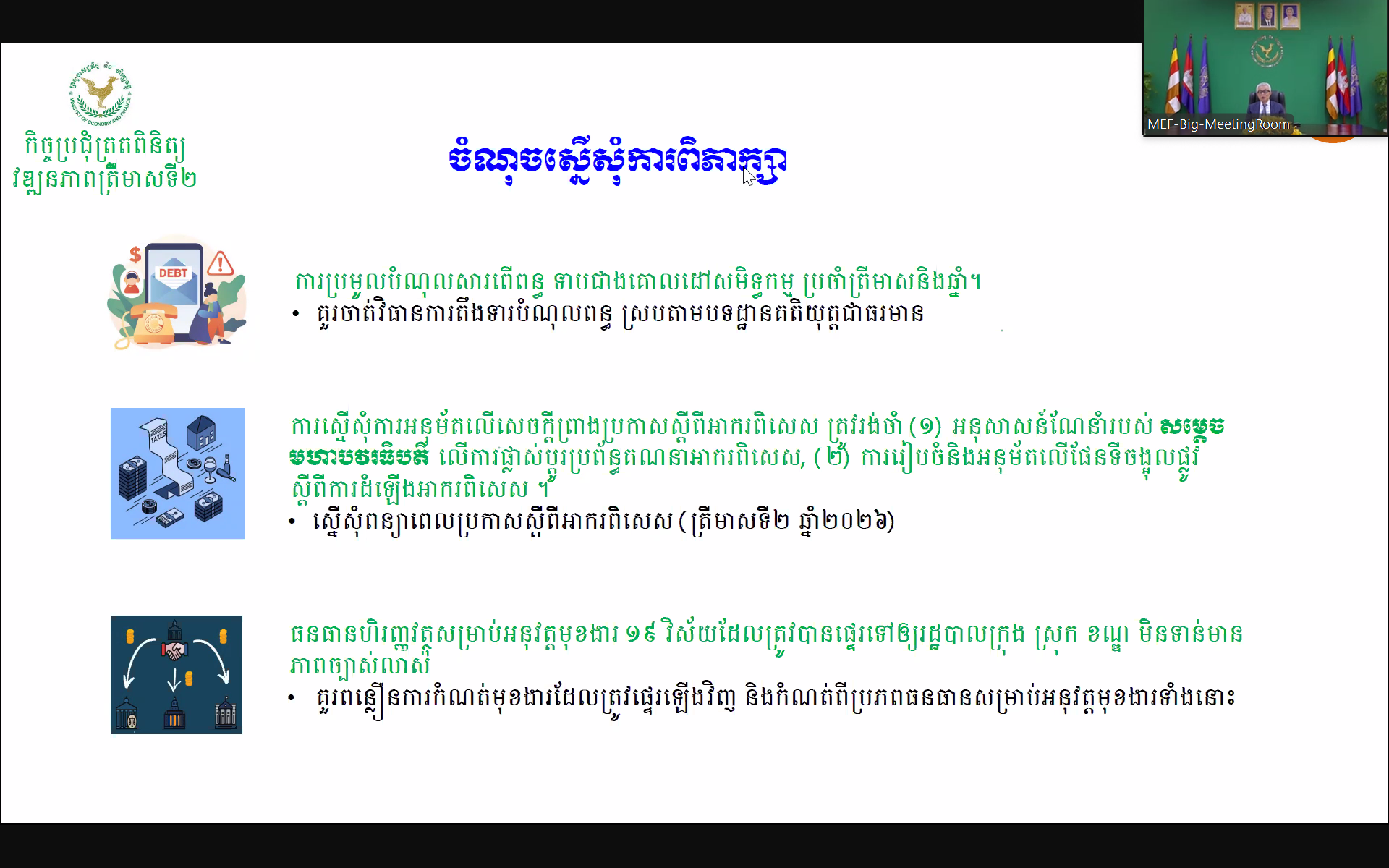 លោក ជ័យ វិមានរិទ្ធ ប្រធានមន្ទីរសេដ្ឋកិច្ចនិងហិរញ្ញវត្ថុខេត្តព្រះសីហនុ រួមជាមួយមន្ត្រីជំនាញ បានអញ្ជើញចូលរួមកិច្ចប្រជុំគណៈកម្មការកែទម្រង់ការគ្រប់គ្រងហិរញ្ញវត្ថុសាធារណៈ ដើម្បីពិនិត្យ និងពិភាក្សាលើរបាយការណ៍សមិទ្ធកម្មប្រចាំត្រីមាសទី២ ឆ្នាំ២០២៥ ក្រោមអធិបតីភាពដ៏ខ្ពង់ខ្ពស់ឯកឧត្ដមអគ្គបណ្ឌិតសភាចារ្យ អូន ព័ន្ធមុនីរ័ត្ន ឧបនាយករដ្ឋមន្ត្រី រដ្ឋមន្ត្រីក្រសួងសេដ្ឋកិច្ចនិងហិរញ្ញវត្ថុ (កសហវ.) និងជាប្រធានគណៈកម្មាធិការដឹកនាំការងារកែទម្រង់ការគ្រប់គ្រងហិរញ្ញវត្ថុសាធារណៈ (គ.ហ.ស.) តាមរយៈប្រព័ន្ធបញ្ជូនរូបភាព និងសម្លេង (Video Conference) ដោយមានការចូលរួមពី ឯកឧត្ដម លោកជំទាវ ជាសមាជិក គ.ហ.ស. និងជាប្រធានក្រុមការងារកែទម្រង់ការគ្រប់គ្រងហិរញ្ញវត្ថុសាធារណៈ នៃក្រសួង-ស្ថាប័ន ថ្នាក់ដឹកនាំ កសហវ. និងគ្រប់អង្គភាពក្រោមឱវាទ កសហវ. រួមទាំងមន្ទីរ សហវ. រាជធានី-ខេត្ត។