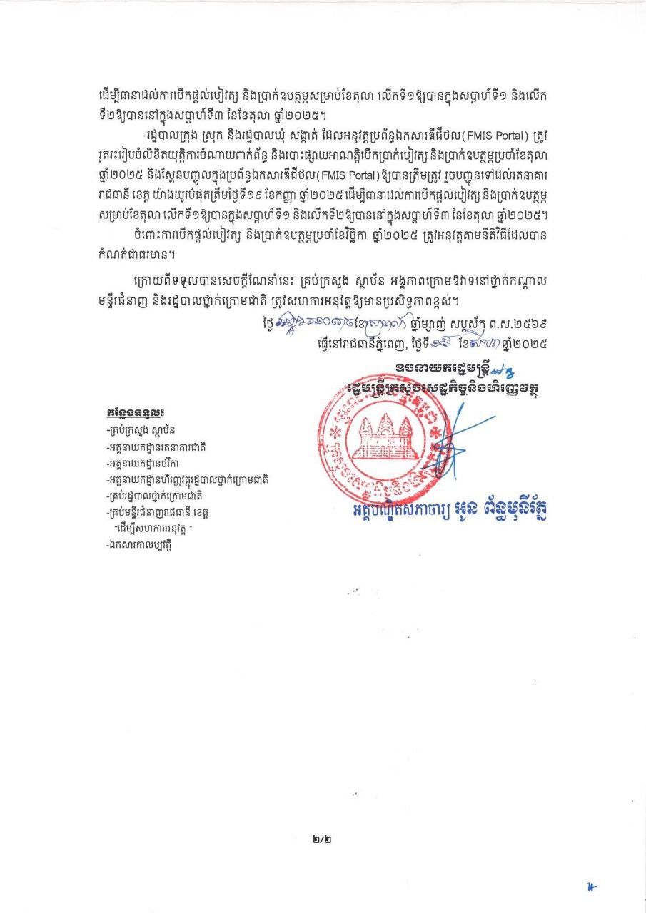 ក្រសួងសេដ្ឋកិច្ច÷ ណែនាំពីការបើកផ្តល់បៀវត្ស និងប្រាក់ឧបត្ថម្ភប្រចាំខែតុលា ឆ្នាំ២០២៥ សម្រាប់រដ្ឋបាលថ្នាក់ជាតិ និងរដ្ឋបាលថ្នាក់ក្រោមជាតិ។