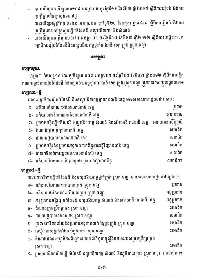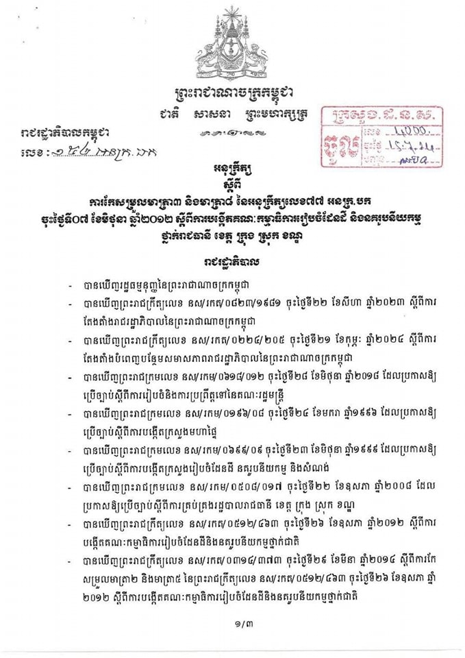 អនុក្រឹត្យ ស្តីពីការកែសម្រួលមាត្រា៣ និងមាត្រា៨ នៃអនុក្រឹត្យលេខ៧៧ អនក្រ.បក ចុះថ្ងៃទី៧ ខែមិថុនា ឆ្នាំ២០១២ ស្តីពីការបង្កើតគណៈកម្មាធិការរៀបចំដែនដី និងនគរូបនីយកម្ម ថ្នាក់រាជធានី ខេត្ត ក្រុង ស្រុក ខណ្ឌ។